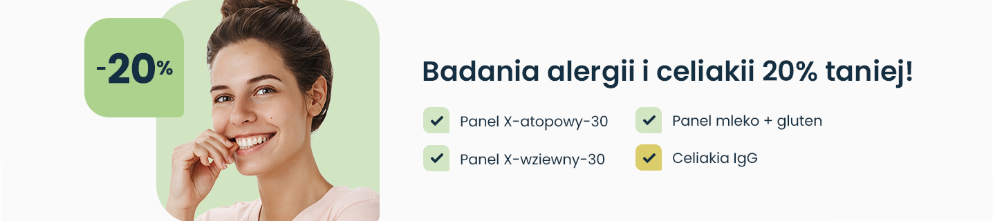 Obecnie wybrane badania w kierunku alergii i celiakii wykonasz 20% taniej. Ilość i czas realizacji badań objętych tą promocją są ograniczone. Szczegółowe informacje znajdziesz w wybranym produkcie.